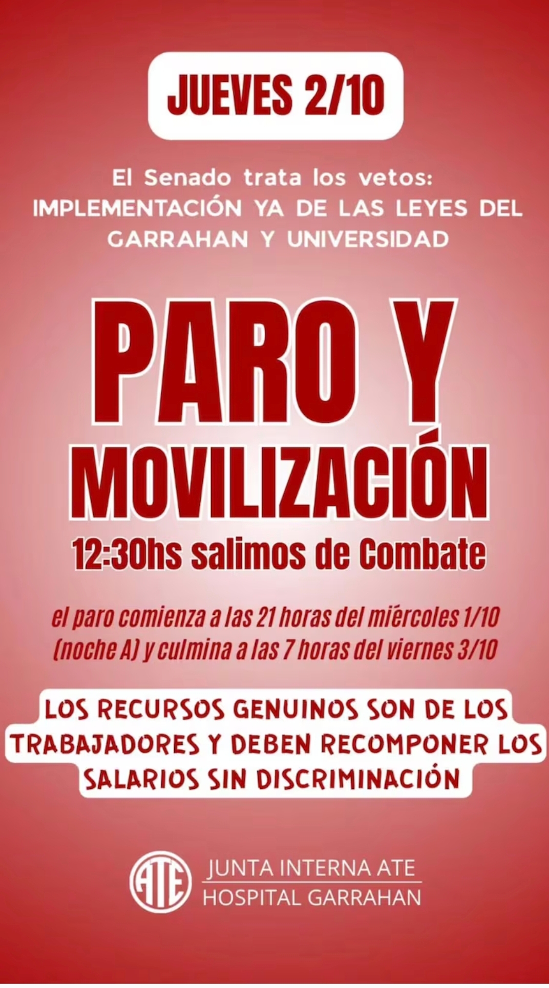 Los trabajadores del Garrahan llevan más de 24 horas de paro y se movilizarán al Congreso este jueves al mediodía para reclamar en contra de veto presidencial a la Ley de Emergencia Pediátrica. El paro de actividades en el centro de salud comenzó a las 21 de este miércoles y se mantendrá hasta las 7 de este viernes 3 de octubre. los manifestantes saldrán desde Combate y marcharán a pie hasta el Congreso de la Nación. La medida de fuerza de los profesionales de la salud se dará en medio de la sesión que se realizará en el Senado, donde la oposición buscará anular los vetos a las leyes de financiamiento universitario y de fondos para el Garrahan. Para el reclamo gremial, la jornada será clave, ya que el destino del proyecto de ley dependerá de los resultados en el Senado. Es decir, si la mayoría que aprobó la iniciativa vuelve a expresar su apoyo, significaría la pérdida de vigencia del veto presidencial y, en consecuencia, la legislación será promulgada de manera automática. La sesión en la Cámara Alta está programada para este jueves a las 10:00 horas. Además de debatirse sobre el veto a la Ley de Emergencia Pediátrica, en el plenario figura el rechazo presidencial a la Ley de Financiamiento Universitario. Por este motivo, se prevé una multitudinaria convocatoria, por parte de los sectores sociales afectados en la Plaza de los dos Congresos. “Implementación ya de las leyes del Garrahan y universidad”, fue la consigna esbozada por la Junta Interna de ATE en el hospital pediátrico, que convocó a sumarse a la marcha hacia el Palacio Legislativo. En el mensaje difundido por redes sociales, plantearon: “Los recursos genuinos son de los trabajadores y deben recomponer los salarios sin discriminación”. La movilización se da luego de que el Gobierno nacional confirmara que entregaría un bono extraordinario destinado al personal médico y administrativo del Garrahan. Este bono iba a ser liquidado en el mes de septiembre y, según el comunicado emitido por el Consejo de Administración del hospital, sería de $450.000 para profesionales y de $350.000 para el resto de trabajadores. El secretario general de la Junta Interna de ATE en el Garrahan, Alejandro Lipcovich, interpretó que el bono sería “una evidente conquista de la lucha del Garrahan, una primera conquista que no resuelve todo el problema”. En línea con esto, señaló que la medida solo sería transitoria y no resolvería el problema salarial que sufren los trabajadores del hospital.