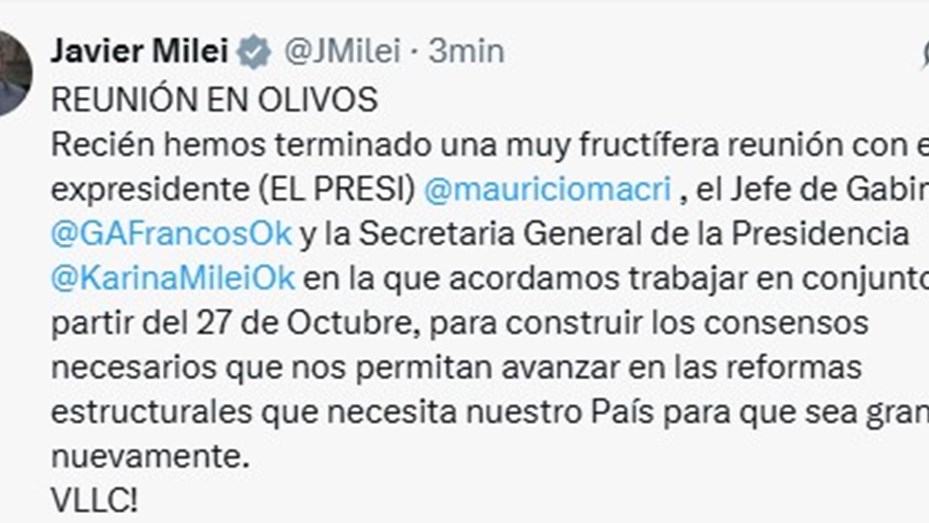 Tras en encuentro, el presidente compartió un mensaje en su cuenta de la red social X: "Recién hemos terminado una muy fructífera reunión con el expresidente (EL PRESI) Mauricio Macri, el Jefe de Gabinete Guillermo Francos y la Secretaria General de la Presidencia, Karina Milei, en la que acordamos trabajar en conjunto, a partir del 27 de Octubre, para construir los consensos necesarios que nos permitan avanzar en las reformas estructurales que necesita nuestro País para que sea grande nuevamente. VLLC!".