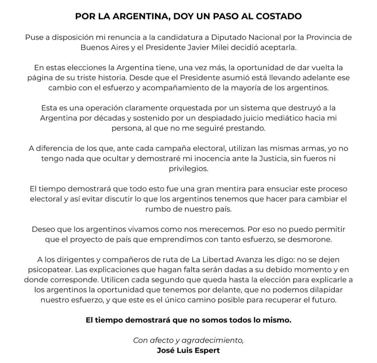 José Luis Espert renunció a su candidatura a diputado por la provincia de Buenos Aires. “Por la Argentina doy un paso al costado. Puse a disposición mi renuncia a la candidatura y el presidente Javier Milei decidió aceptarla”, escribió el economista en sus redes sociales. La confirmación se dio después de días de vacilación, donde miembros del Gabinete insistían con sacar de la carrera electoral al actual diputado, mientras que el mandatario lo ratificaba. “Esta es una operación claramente orquestada por un sistema que destruyó a la Argentina por décadas y sostenido por un despiadado juicio mediático hacia mi persona, al que no me seguiré prestando”, dijo Espert en su comunicado. Y agregó: “A diferencia de los que, ante cada campaña electoral, utilizan las mismas armas, yo no tengo nada que ocultar y demostraré mi inocencia ante la Justicia, sin fueros ni privilegios. El tiempo demostrará que todo esto fue una gran mentira para ensuciar este proceso electoral y así evitar discutir lo que los argentinos tenemos que hacer para cambiar el rumbo de nuestro país”. “Deseo que los argentinos vivamos como nos merecemos. Por eso no puedo permitir que el proyecto de país que emprendimos con tanto esfuerzo, se desmorone”, se justificó Espert. Además, le envió un mensaje a los dirigentes de La Libertad Avanza: “No se dejen psicopatear. Las explicaciones que hagan falta serán dadas a su debido momento y en donde corresponde. Utilicen cada segundo que queda hasta la elección para explicarles a los argentinos la oportunidad que tenemos por delante, que no podemos dilapidar nuestro esfuerzo, y que este es el único camino posible para recuperar el futuro. El tiempo demostrará que no somos todos lo mismo”. La respuesta de Javier Milei tras la decisión de Espert de bajarse de su candidatura Tras el anuncio de Espert, el Presidente se expresó en las redes sociales: “El proceso de cambio profundo que estamos llevando adelante es lo único que importa. No vamos a permitir que una operación maliciosa lo ponga en riesgo. Esto es una causa al servicio de cambiar el país. La Argentina siempre está por encima de las personas”. Y sostuvo: “Garantizar el cambio es más importante que cualquiera de nosotros. Aunque nos quieran ensuciar, no somos lo mismo. La Libertad Avanza o Argentina retrocede”.