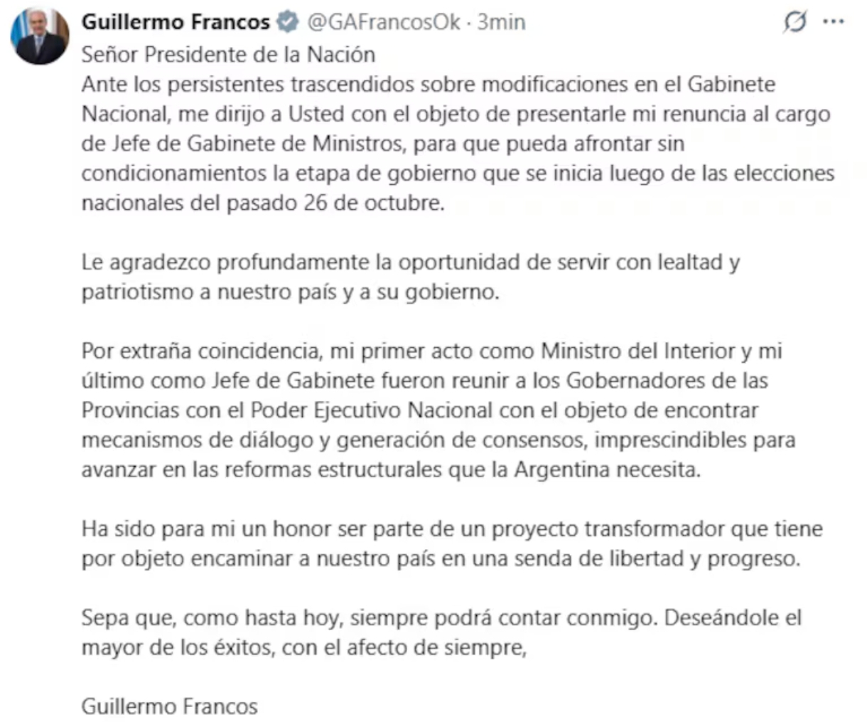 Luego de los rumores de cambios en el Gobierno de Javier Milei, Guillermo Francos presentó su renuncia este viernes a la noche como jefe de Gabinete. El vocero presidencial Manuel Adorni lo reemplazará a partir del lunes. “Ante los persistentes trascendidos sobre modificaciones en el Gabinete Nacional, me dirijo a usted con el objeto de presentarle mi renuncia al cargo de jefe de Gabinete de Ministros, para que pueda afrontar sin condicionamientos la etapa de gobierno que se inicia luego de las elecciones nacionales del pasado 26 de octubre”, escribió Francos en X, en un posteo dirigido a Milei. También renunció el ministro del Interior, Lisandro Catalán, hombre de confianza de Francos. Tras la victoria de La Libertad Avanza en las elecciones legislativas se habló mucho de modificaciones en el Ejecutivo y llegó la renuncia de Francos. Su lugar será ocupado por Manuel Adorni, actual vocero presidencial. Respecto de la elección de Adorni, en el Gobierno indicaron a través de un comunicado que responde a la necesidad de “renovar el diálogo político y esta segunda etapa que empieza a partir del 10 de diciembre”. Además, agradecieron a Francos, a quien señalaron como alguien “fundamental en esta primera etapa de Gobierno para avanzar en todas las etapas que se han llevado adelante en estos dos años. Y remarcaron: ”La Nación siempre estará en deuda con él”. Noticia que está siendo actualizada.-