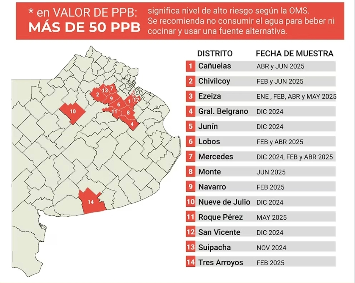 Cuáles son los distritos bonaerenses más afectados por la presencia de arsénico en el agua de consumo