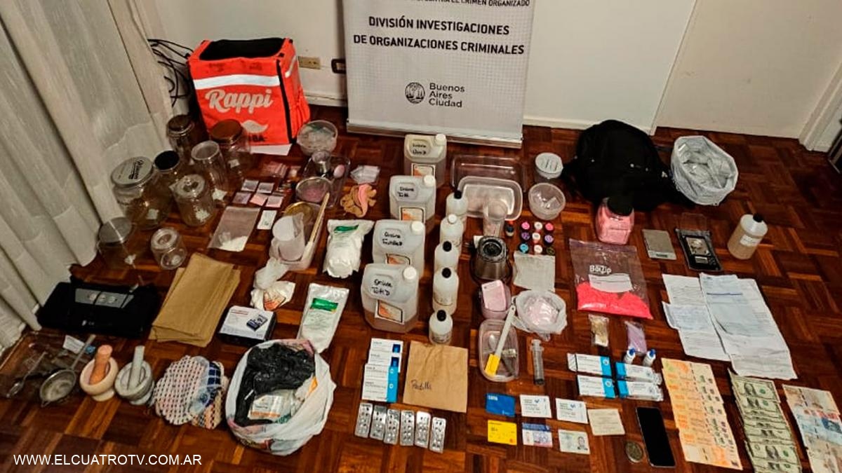 También fueron incautados varios bidones que contenían ketamina, elementos de corte tales como maltoderina y cafeína anhidra, bidones de cinco litros de sustancias químicas varias, potes con colorantes y saborizantes, balanzas de precisión, medicamentos de todo tipo en cápsulas y pastillas picadas, recipientes varios, coladores y mezcladoras.