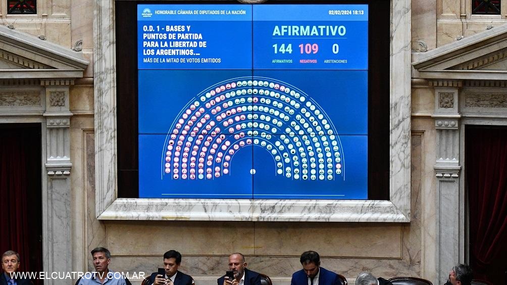 La Cámara de Diputados aprobó en general por 144 votos contra 109 el proyecto de ley "Bases y Principios para la Libertad de los Argentinos", que establece una emergencia pública, una reforma del Estado y la privatización de varias empresas públicas, y pasó a cuarto intermedio hasta el martes próximo a las 14 para el tratamiento de la iniciativa artículo por artículo.