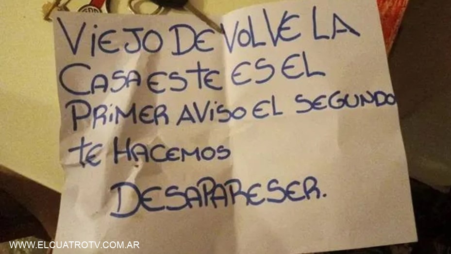 Según informó La Capital, en la vivienda ubicada cerca del citado Destacamento que se encuentra sobre la avenida San Martín, entre Rueda y Virasoro, dejaron una nota por debajo de la puerta, en la que desconocidos indicaron: “Viejo devolvé la casa. Este es el primer aviso. El segundo te hago desaparecer”.
