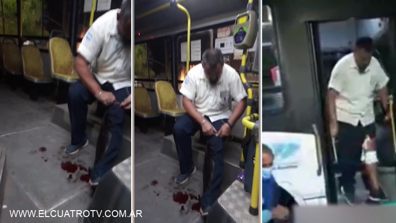 En las imágenes se ve cómo el colectivero, sentado en uno de los asientos del coche y sobre un charco de sangre, se realiza un torniquete para tratar de frenar la hemorragia. Esa acción fue crucial para poder salvar su vida.