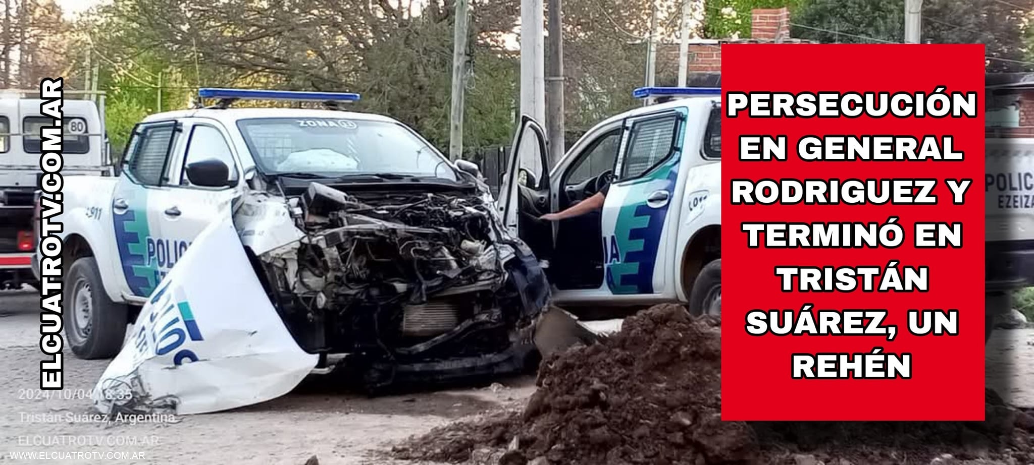 La persecución se inició en General Rodríguez donde los delincuentes robaron una camioneta y secuestraron al dueño en la persecución que terminó en el barrio Santa Marta de Tristán Suárez también con resultaron heridos dos mujeres policías que son las que majebana el patrullero.