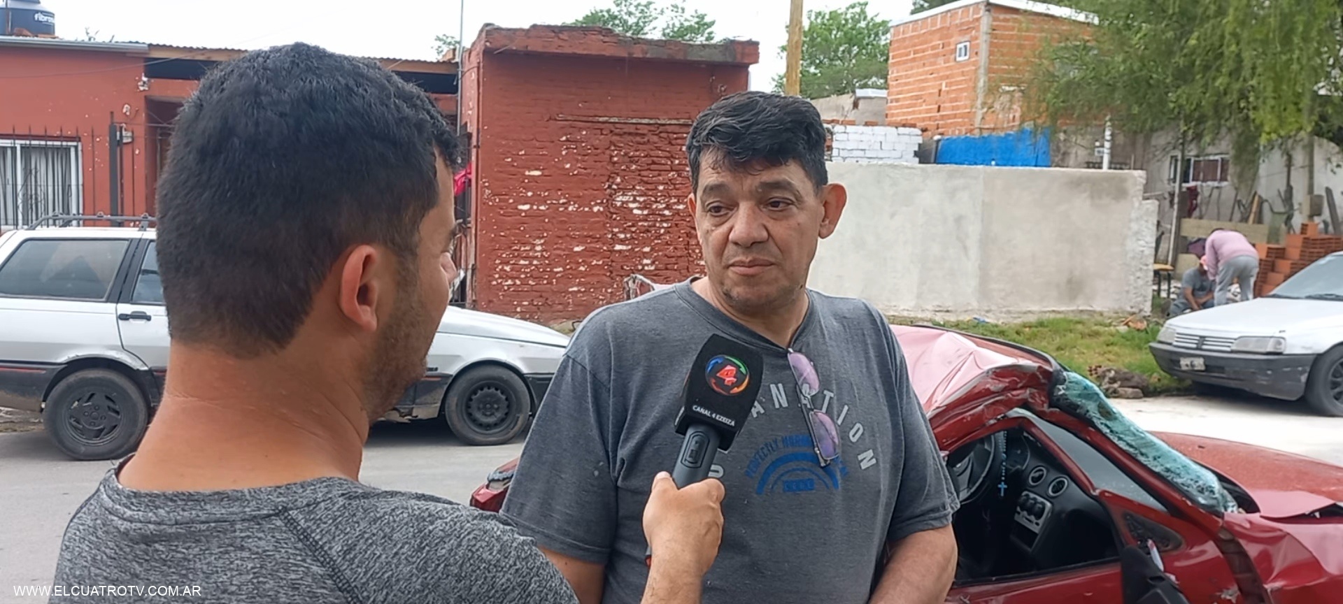 Es un auto que lo queremos en la familia se lo presto a mis hijas cuando se van de vacaciones, anduvo por todos lados y nunca le pasó nada. Y ahí quedó destruido, dice ante a elcuatrotv.com.ar Marcelo en la puerta de su casa mirnado el Suzuki Fue modelo 2005 al que, de milagro, no se le reventó el quipo de gas cuando lo chocó el conductor de 20 años a bordo de una jeep Renegade. También quedó intacta el rosario que tenía colhado del espejo retrovisor.