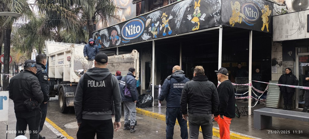 Durante la jornada, empleados del comercio continuaron removiendo restos calcinados. Las autoridades aún investigan las causas del incendio.