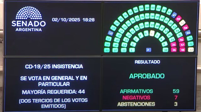 La ley de emergencia del sistema de salud pediátrico fue ratificada con 59 votos a favor, 7 en contra y 3 abstenciones (todas del PRO). En tanto, la de financiamiento universitario obtuvo 58 votos a favor, 7 en contra y 4 abstenciones.