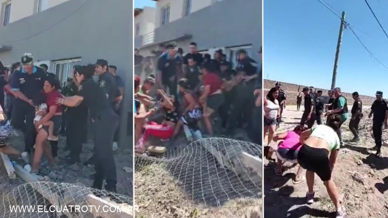 En las imágenes se puede ver la confrontación de la policía con un grupo de alrededor de unas 20 personas, la mayoría mujeres con sus hijos pequeños, que habían tirado abajo el alambrado perimetral del sitio e ingresaron de manera ilegal.